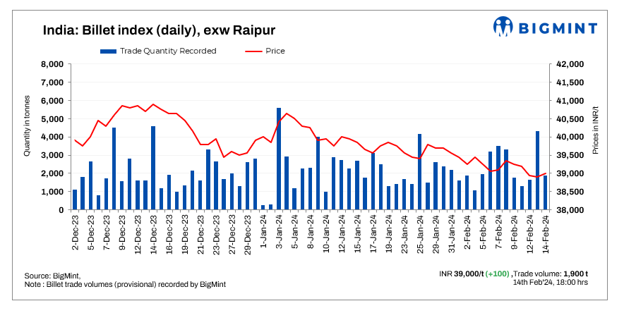 BigMint’s billet index increased by INR 100/t, reaching to INR 39,000/t exw-Raipur on 14 February, 2024.