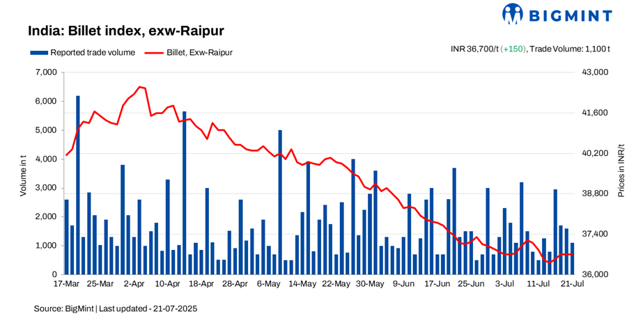 BigMint’s billet index increased by INR 150/tonne (t) d-o-d, settling at INR 36,700/t exw-Raipur on 21 July 2025. The upward trend was primarily driven by continued raw material cost pressure, even as buying activity in the semi-finished steel segment remained subdued.