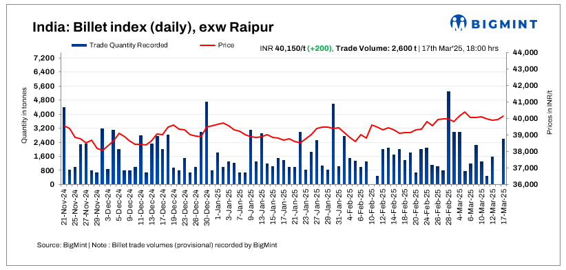 BigMint’s billet index rose slightly by INR 200/t, settling at INR 40,150/t exw-Raipur on 17 March 2025.