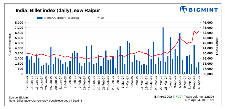BigMint’s billet index increased by INR 400/t to INR 44,300/t exw Raipur as on 17 April, 2024.