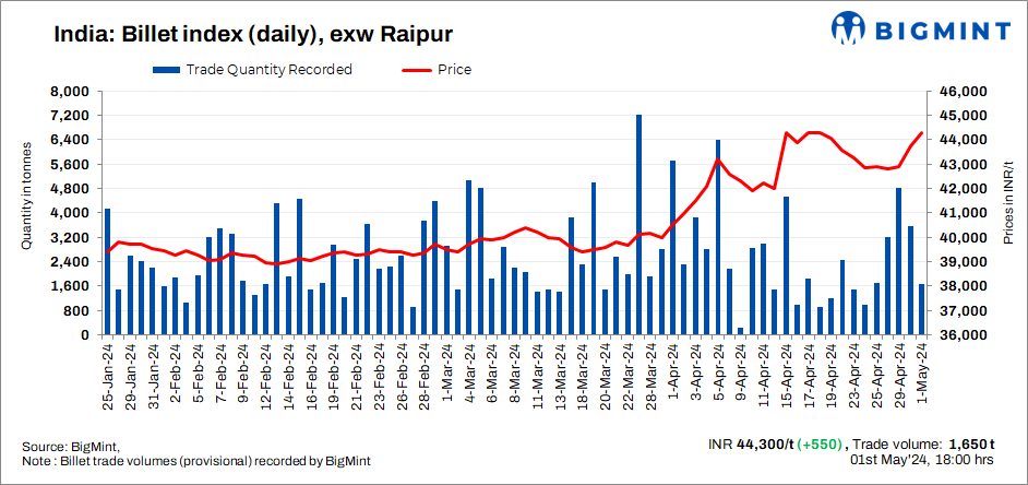 BigMint’s billet index edged upward today, witnessing an increase of INR 550/t d-o-d, settling at INR 44,300/t exw-Raipur on 1 May, 2024.
