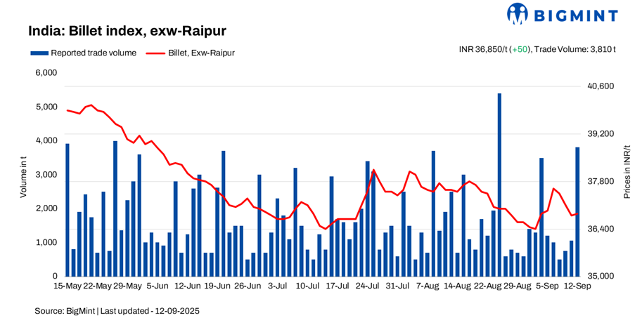 BigMint’s billet index inched up by INR 50/tonne (t) d-o-d to INR 36,850/t exw-Raipur on 12 September 2025. Improved buying interest and moderate bookings supported billet spot offers, aided by slightly positive cues from neighbouring markets.