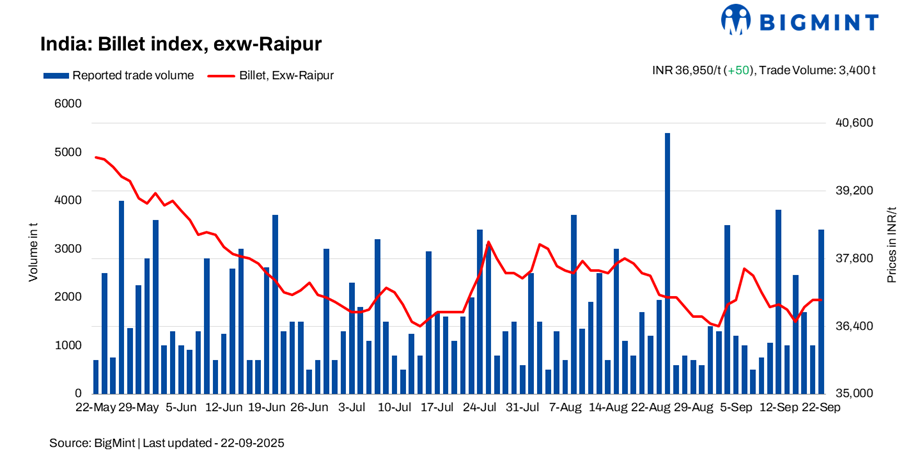 BigMint’s billet index rose marginally by INR 50/t d-o-d, settling at INR 36,950/t exw-Raipur on 22 September 2025. Improved buying interest and moderate bookings supported semi-finished steel offers, aided by positive cues from nearby states.