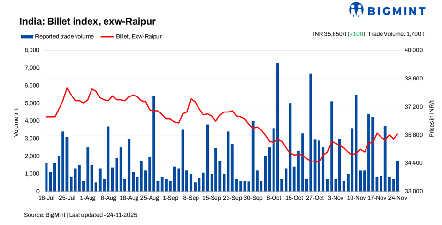 BigMint’s billet index inched up by INR 100/t d-o-d to INR 36,850/t exw-Raipur on 24 November. Amid the marginal uptick, overall buying interest remained limited, as downstream demand continued to soften.