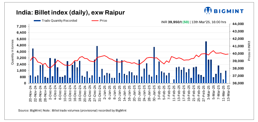 BigMint’s billet index rose slightly by INR 50/tonne (t), settling at INR 39,950/t exw-Raipur on 13 March 2025.