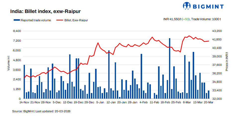 BigMint’s billet index in Raipur inched up by INR 50/t d-o-d to INR 41,550/t ex-works on 20 March 2026, marking a marginal recovery after recent corrections. Despite the uptick, overall market sentiment remained subdued due to weak enquiries and cautious procurement amid persistent volatility.