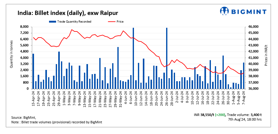 BigMint’s billet index inched up by INR 200/tonne (t) to INR 38,550/t exw-Raipur on 7 August, 2024