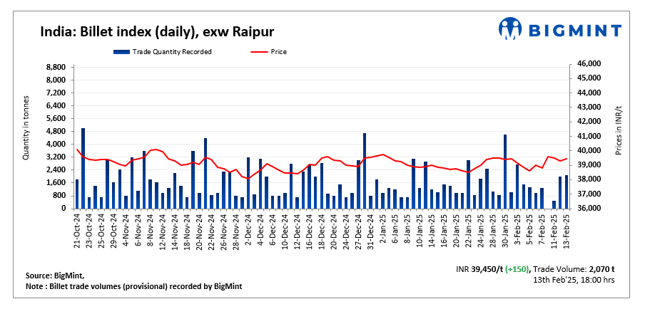 BigMint’s billet index rose slightly by INR 150/tonne (t) to INR 39,450/t exw-Raipur on 13 February 2025.