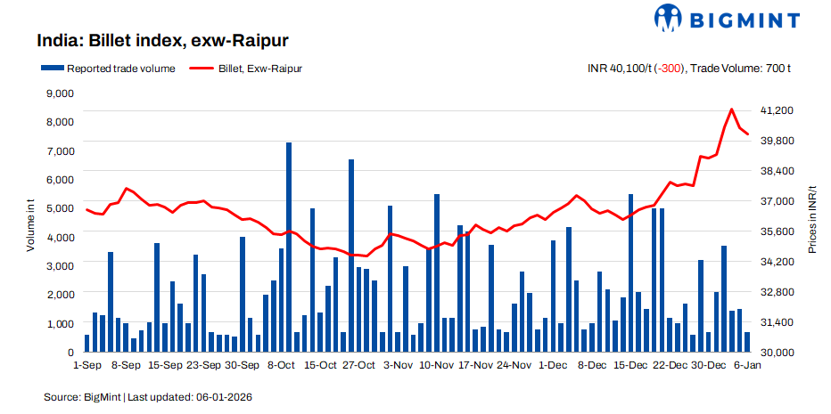 BigMint’s Billet Index declined by INR 300/t d-o-d to INR 40,100/t exw-Raipur on 6 January 2026, amid subdued procurement activity and weak market sentiment. Buyers remained cautious in a bearish environment, restricting purchases strictly to immediate requirements.