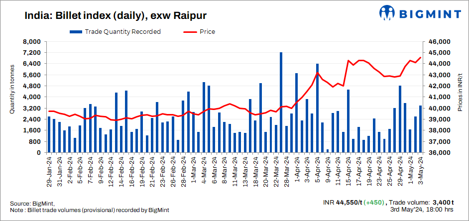 BigMint’s billet index rose by INR 450/tonne (t), to INR 44,550/t exw-Raipur on 3 May, 2024.