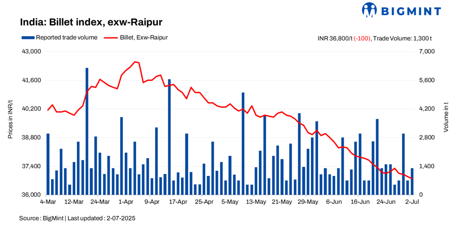 BigMint’s daily billet index declined further by INR 100/tonne (t) d-o-d, settling at INR 36,800/t exw-Raipur on 2 July 2025, as weak market sentiment persisted despite softer spot offers.