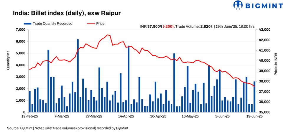 BigMint’s billet index dropped further by INR 200/tonne (t) d-o-d, settling at INR 37,500/t exw-Raipur on 19 June 2025, as market sentiment remained weak despite continued softening in spot offers.