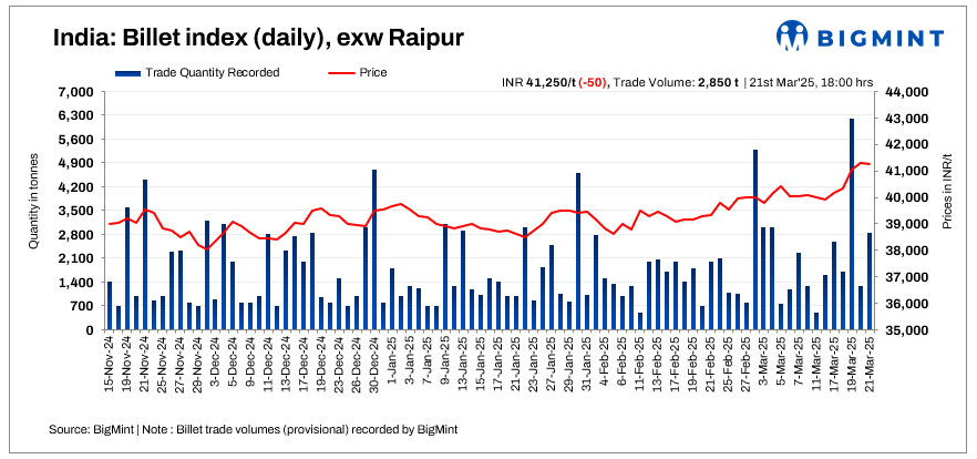 BigMint’s billet index edged lower by INR 50/tonne (t) d-o-d to INR 41,250/t exw-Raipur on 21 March 2025.