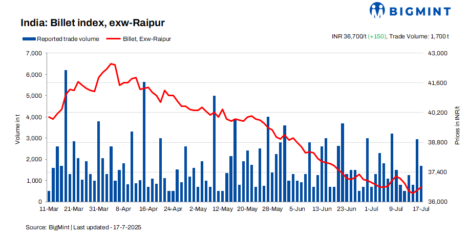 BigMint’s billet index rosefurther by INR 150/tonne (t) d-o-d, settling at INR 36,700/t exw-Raipur on 17 July 2025. The increase was mainly due to positive market sentiment and price support from neighbouring regions, despite limited buying activity in the semi-finished segment.