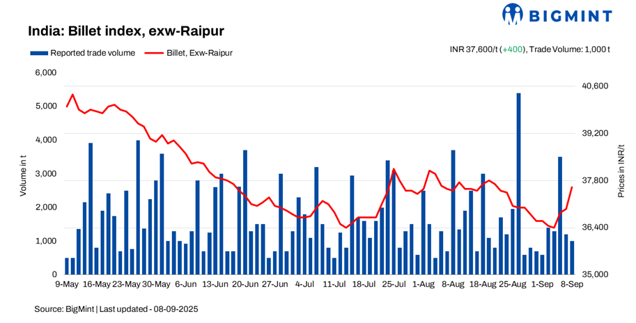 BigMint’s billet index surged by INR 400/t d-o-d, settling at INR 37,600/t exw-Raipur on 8 September 2025. Amid the sharp rise, buying activity remained subdued, with participants resisting higher spot offers amid weaker finished steel movement.