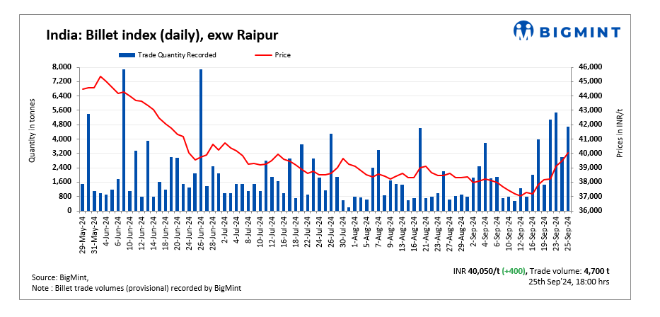 BigMint’s billet index rose further by INR 550/tonne (t) to INR 40,050/t exw-Raipur on 25 September 2024.