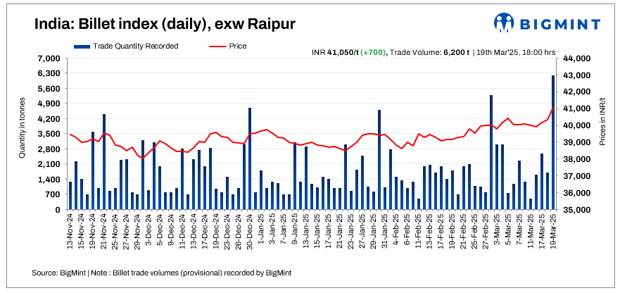 BigMint’s billet index surged by INR 700/tonne (t) d-o-d to settle at a four-month high of INR 41,050/t exw-Raipur on 19 March 2025.