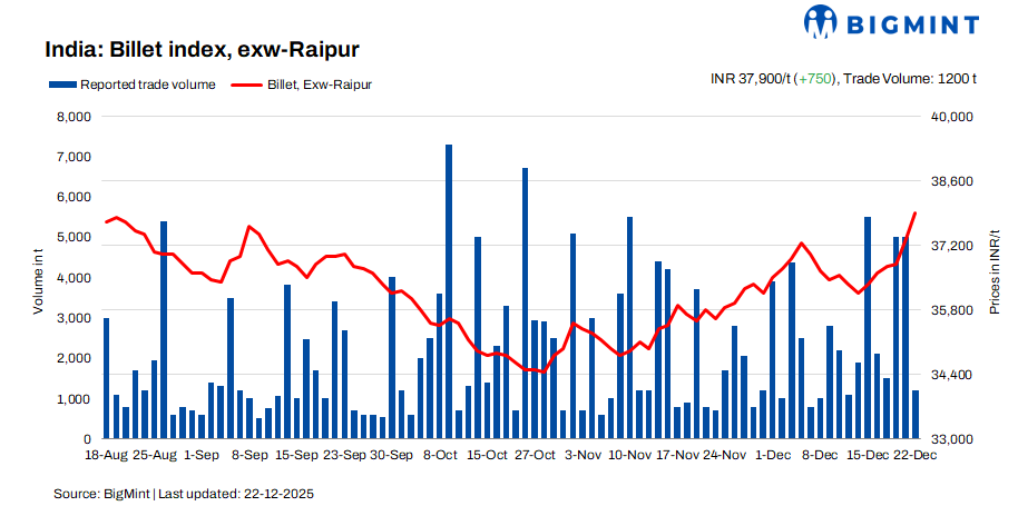 BigMint’s billet index registered a sharp increase of INR 750/tonne (t) d-o-d to INR 37,900/t exw-Raipur on 22 December 2025. The steep rise was driven by strong influence from neighbouring markets and heightened price volatility across both the semi-finished and finished steel segments throughout the trading session.