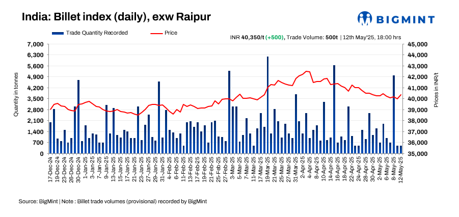 BigMint’s billet index recorded a sharp uptick of INR 500/tonne (t) d-o-d to INR 40,350/t exw-Raipur on 12 May 2025, even as overall buying activity remained limited due to elevated offers.