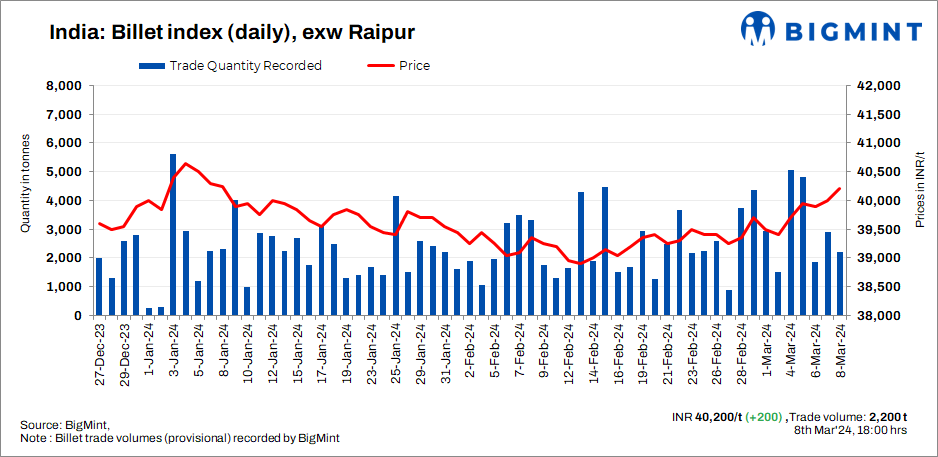 BigMint’s billet index was assessed at INR 40,000/tonne (t) exw-Raipur, up by INR 200/t, on 8 March, 2024.