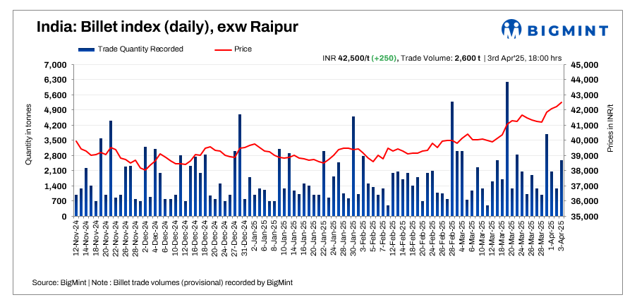 BigMint’s billet index surged to a nine-month high, rising by INR 250/t d-o-d to reach INR 42,500/t exw-Raipur on 3 April 2025.