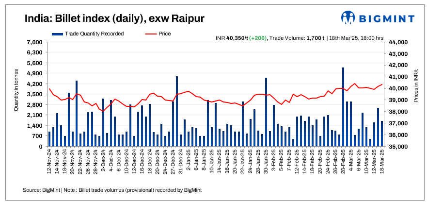 BigMint’s billet index today rose a further INR 200/t, reaching INR 40,350/t exw-Raipur on 18 March 2025.