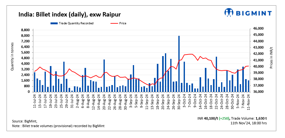 BigMint’s billet index rose slightly by INR 250/tonne (t) today to INR 40,100/t exw-Raipur on 11 November 2024.