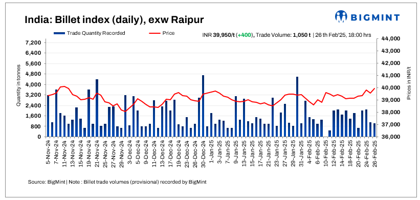 BigMint’s billet index rose further by INR 400/tonne (t) today to reach INR 39,950/t exw-Raipur on 26 February 2025.