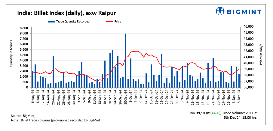 BigMint’s billet index increased further by INR 450/tonne (t), reaching INR 39,100/t exw-Raipur on 5 December 2024.