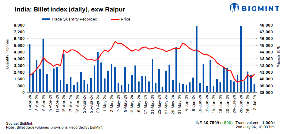 BigMint’s billet index increased by INR 500/tonne (t) d-o-d to INR 40,750/t exw-Raipur on 2 July, 2024.