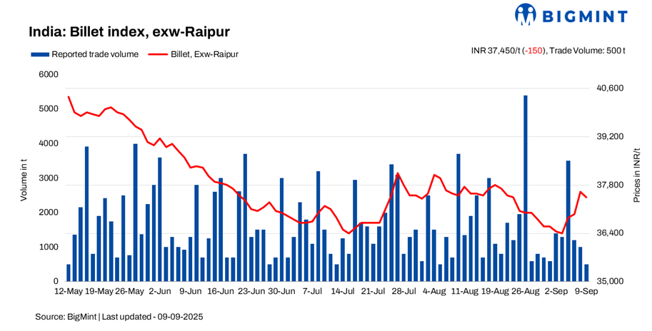 BigMint’s billet index declined marginally by INR 150/tonne (t) d-o-d, settling at INR 37,450/t exw-Raipur on 9 September 2025. The recent upward rally paused as weak demand and muted buyer participation failed to support higher spot offers, particularly amid sluggish finished steel movement.