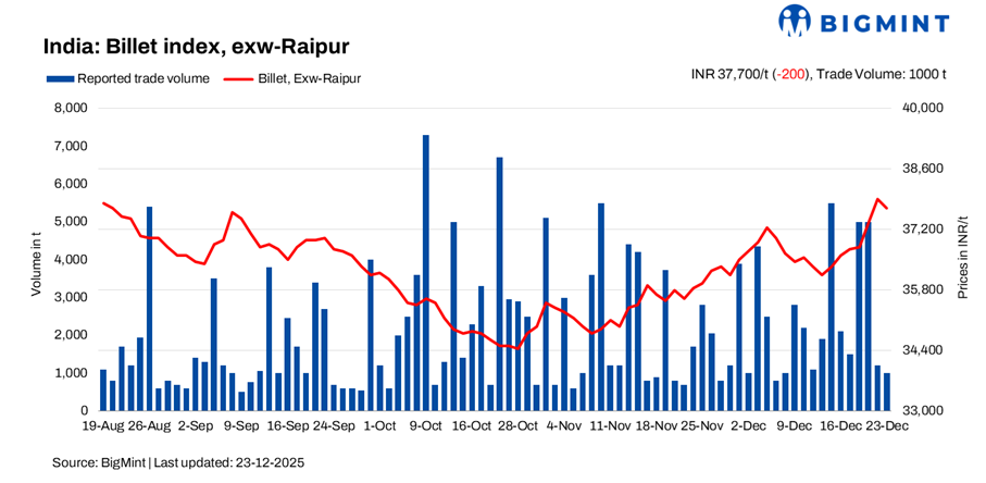 BigMint’s billet index edged lower by INR 200/tonne (t) d-o-d to INR 37,700/t exw-Raipur on 23 December 2025, as subdued enquiries and cautious market sentiment weighed on overall activity. Despite minor price corrections in select trades, buyers largely maintained a wait-and-watch stance amid uncertainty surrounding near-term price direction.