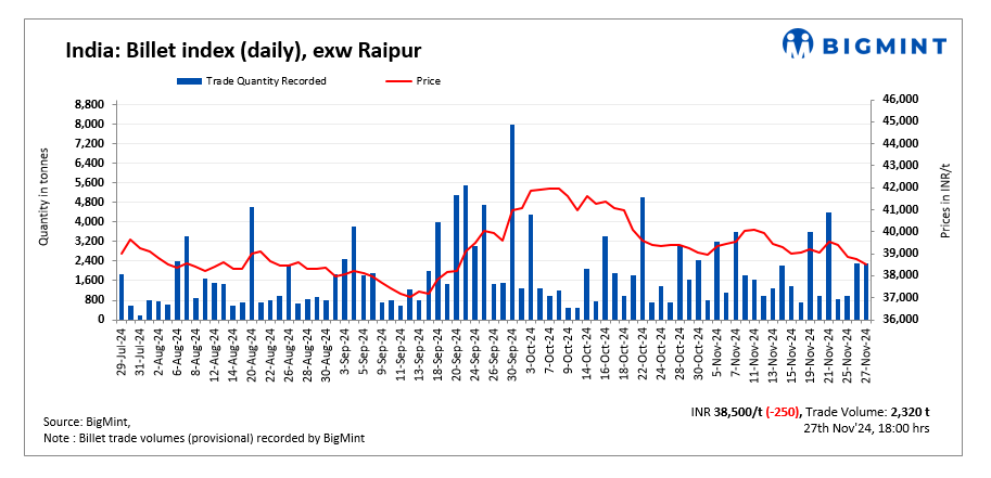BigMint’s billet index fell further by INR 250/tonne (t) d-o-d to INR 38,500/t exw-Raipur on 27 November 2024. Notably, the index has been on a downtrend since 22 November.