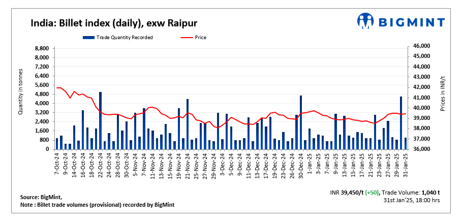 BigMint’s billet index moved up slightly today by INR 50/t, settling at INR 39,450/tonne (t) exw-Raipur on 31 January 2025.