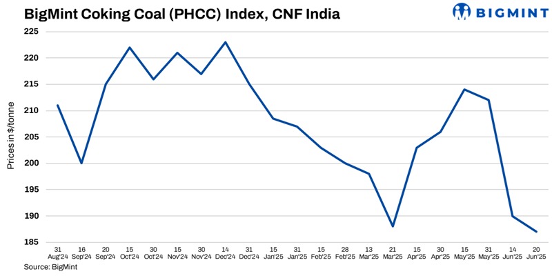 BigMint’s premium hard coking coal (PHCC) index was assessed at $187/tonne (t) CNF Paradip, India, on 20 June 2025, down by $3/t against the previous assessment on 14 June. Lower bids and falling met coke prices were the primary reasons behind the price drop.