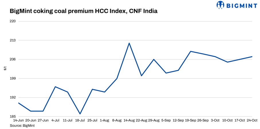 BigMint’s premium hard coking coal (PHCC) index rose by $1/t w-o-w to $207/t CNF Paradip, India, on 24 Oct’25. Although trade inquiries stayed limited, stronger Chinese buying indications pushed up FOB Australia offers, driving a global increase in coking coal prices.