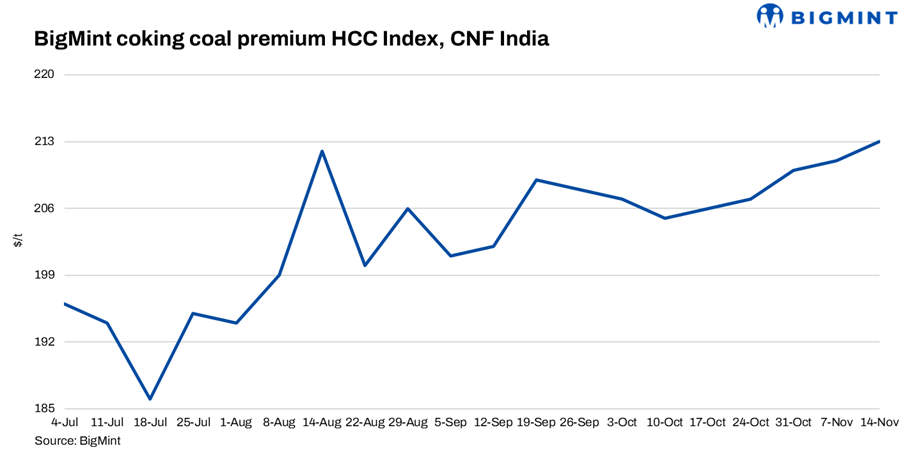 BigMint’s premium hard coking coal (PHCC) index was assessed at $213/tonne (t) CNF Paradip, India, on 14 November 2025, up by $2/t against the previous assessment on 7 November 2025.