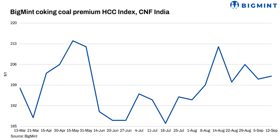 BigMint’s premium hard coking coal (PHCC) index was assessed at $202/tonne (t) CNF Paradip, India, on 12 September 2025, up by $1/t against the previous assessment on 5 September 2025. Limited market activity kept prices stagnant.