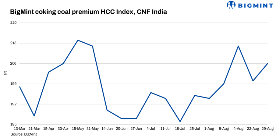 BigMint’s premium hard coking coal (PHCC) index was assessed at $206/tonne (t) CNF Paradip, India, on 29 August 2025, up by $6/t against the previous assessment on 22 August. Australian coking coal offers were down by about $5/t w-o-w.