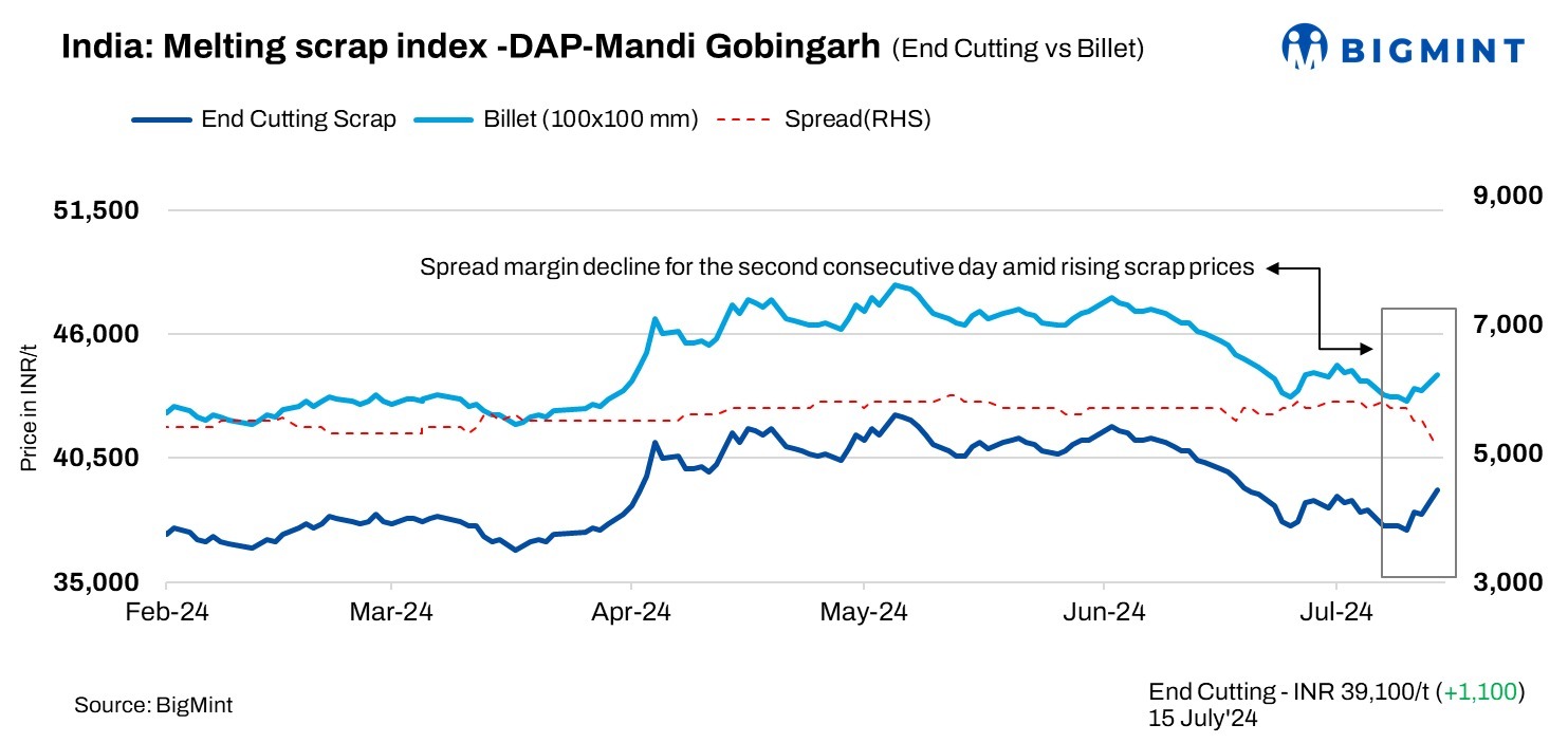 BigMint’s domestic end-cutting scrap index tracking the Mandi Gobindgarh market significantly increased by INR 1,100/t to INR 39,100/t DAP on 15 July, 2024.
