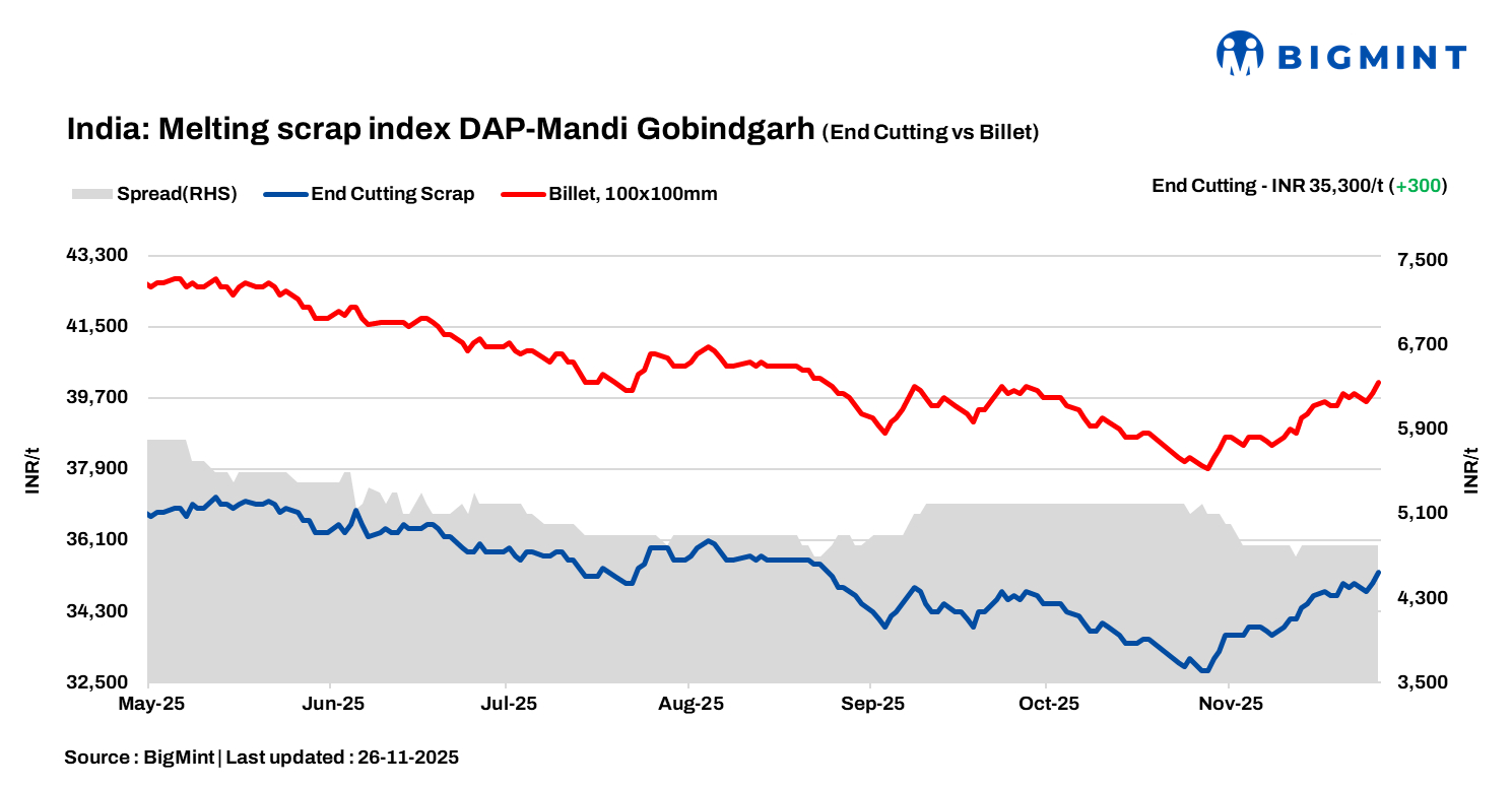 BigMint’s domestic end-cutting scrap index, tracking the Mandi Gobindgarh market, rose by INR 300/tonne (t) d-o-d to INR 35,300/t DAP on 26 Nov.