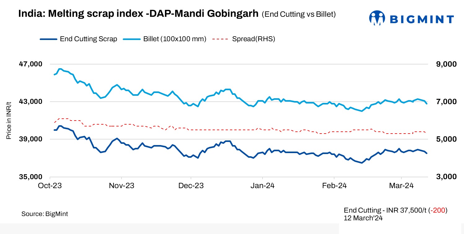 On 12 March, 2024, BigMint’s report indicated a drop in the index for domestic steel scrap (end-cutting) in Mandi Gobindgarh by INR 200/t, settling at INR 37,500/t on a delivered-at-plant (DAP) basis. The steel market in the region saw subdued buying activity, with mills procuring scrap at levels based on immediate need.
