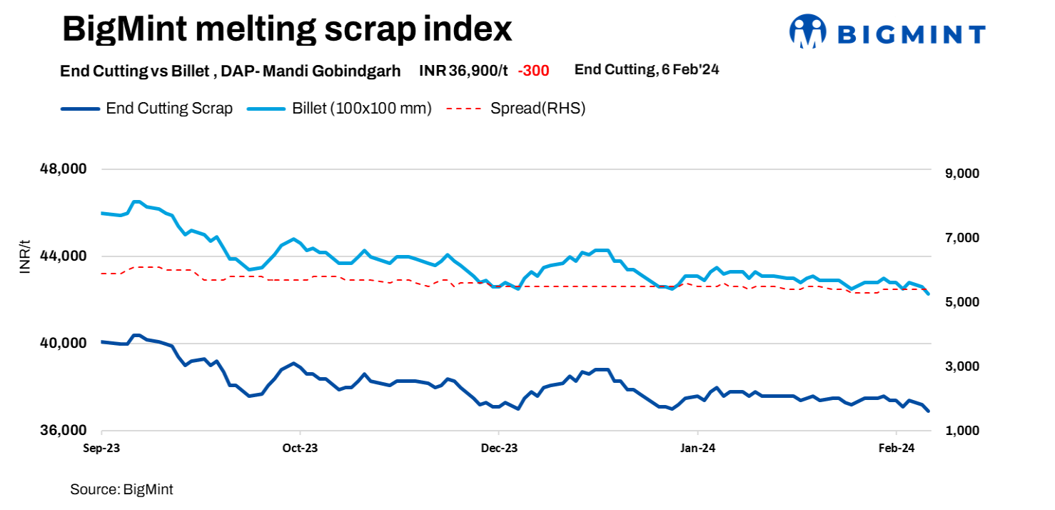 The index for domestic steel scrap (end-cutting) in Mandi Gobindgarh, according to BigMint, saw a decrease of INR 300/t on 6 February, 2024, settling at INR 36,900/t on a delivered-at-plant (DAP) basis. Mills in Mandi are procuring domestic scrap at subdued levels today, reflecting the sluggishness in the finished steel market. The market is experiencing a shortage of scrap, prompting a slight uptick in the acquisition of sponge iron for the steel-making charge mix.
