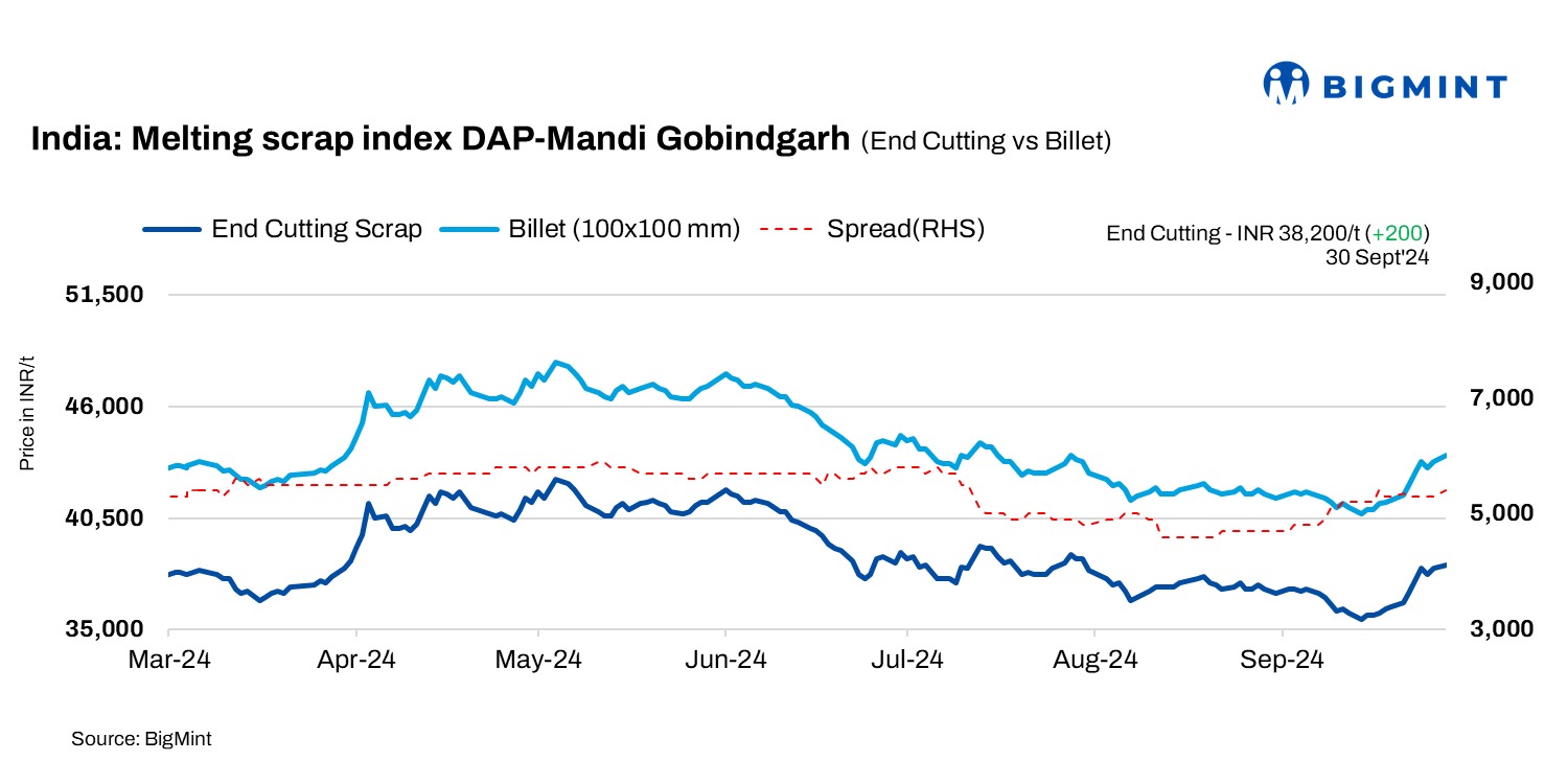 End-cutting-billets spread: In Mandi, the end-cutting scrap and billet spread was at INR 5,400/t.