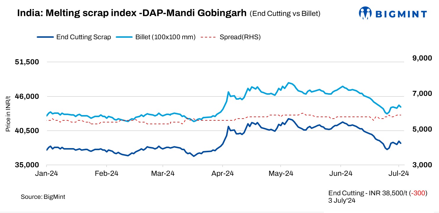 BigMint’s domestic end-cutting scrap index tracking the Mandi Gobindgarh market dropped by INR 300/tonne (t) ($3.59/t) to INR 38,500/t ($461/t) DAP on 3 July, 2024. Trade activity in the region was slow compared to the past couple of days, but mills are focusing on domestic scrap as the imported material is not offering price viability at the moment. The market appears range-bound this week, with ingot prices expected to remain between INR 44,000-44,500/t in Mandi. The trade momentum is likely to fluctuate based on buying activity.