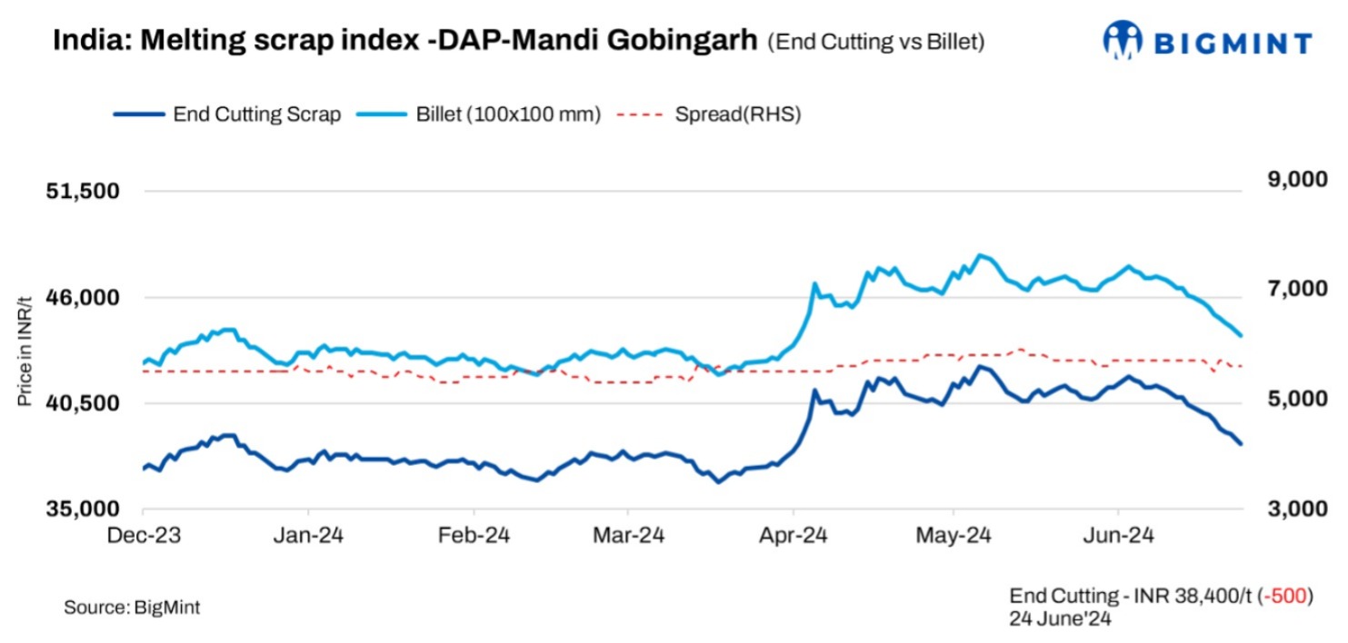 BigMint’s domestic end-cutting scrap index fell by INR 500/t to INR 38,400/t DAP in the Mandi Gobindgarh market on 24 June, 2024. Local buyers anticipated a continued decline in prices across all steel segments, with ingot prices dropping to INR 44,000/t. Additionally, scrap buyers faced challenges in procuring material at these lower prices as suppliers held onto their stock today. In the region, scrap prices dipped by INR 2,300/t on a m-o-m basis as prices touched a three-month low.