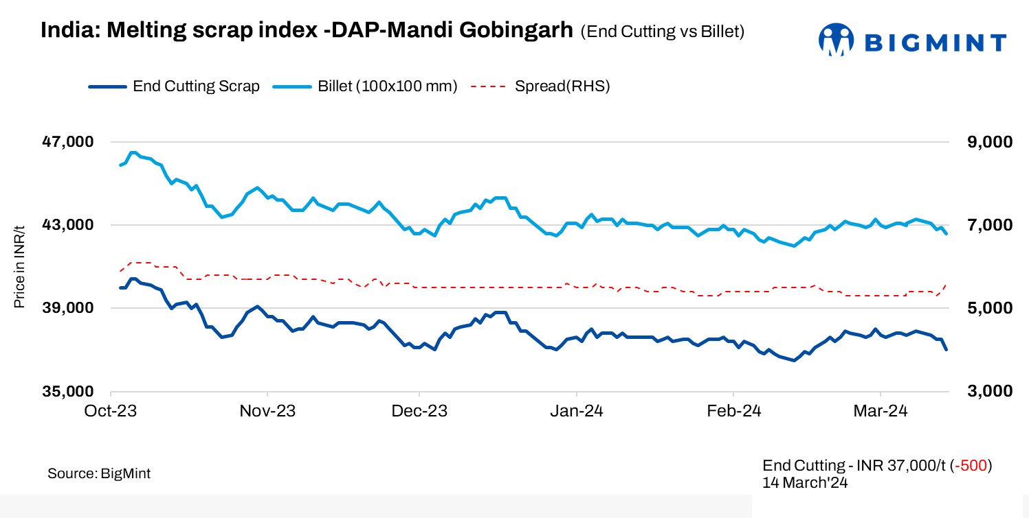 BigMint’s ferrous scrap index on 14 March, 2024, showed a decline in domestic end-cutting scrap prices at Mandi Gobindgarh steel market, dropping by INR 500/t to INR 37,000/t for DAP (delivered at plant) basis.