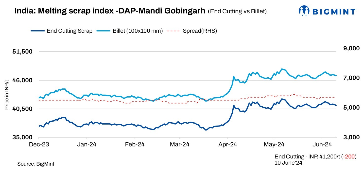 BigMint’s domestic end-cutting scrap index, decreased by INR 200/tonne (t) to INR 41,200/t DAP on 10 June, 2024. Mills persisted in sourcing scrap from the region, while buyers in the semi-finished steel market have remained quiet compare to yesterday’s trading session.