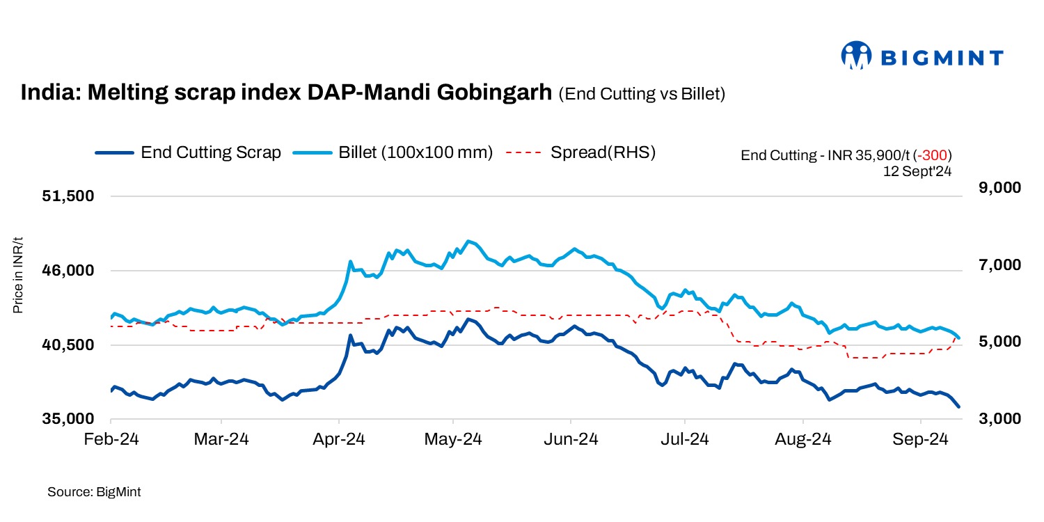 BigMint’s domestic end-cutting scrap index tracking the Mandi Gobindgarh market saw a price reduction of INR 300/tonne (t), settling at INR 35,900/t DAP today. On a weekly basis, Mandi scrap prices have dropped by INR 1,100-1,500/t due to muted demand.
