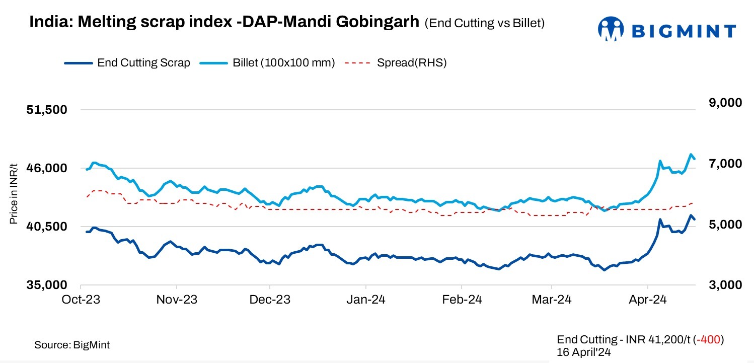 BigMint’s domestic end-cutting scrap index in the Mandi Gobindgarh steel market decreased by INR 400/tonne (t) to INR 41,200/t DAP on 16 April. No significant deals were closed in the scrap market as mills anticipate further declines in the near term.